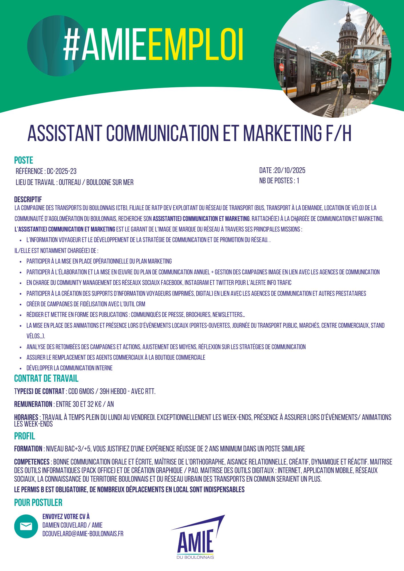 compétences : Bonne communication orale et écrite, maîtrise de l’orthographe, Aisance relationnelle, créatif, dynamique et réactif. Maitrise des outils informatiques (Pack Office) et de création graphique / pao. maitrise des outils digitaux : internet, application mobile, réseaux sociaux, la Connaissance du territoire boulonnais et du réseau urbain des transports en commun seraient un plus.
