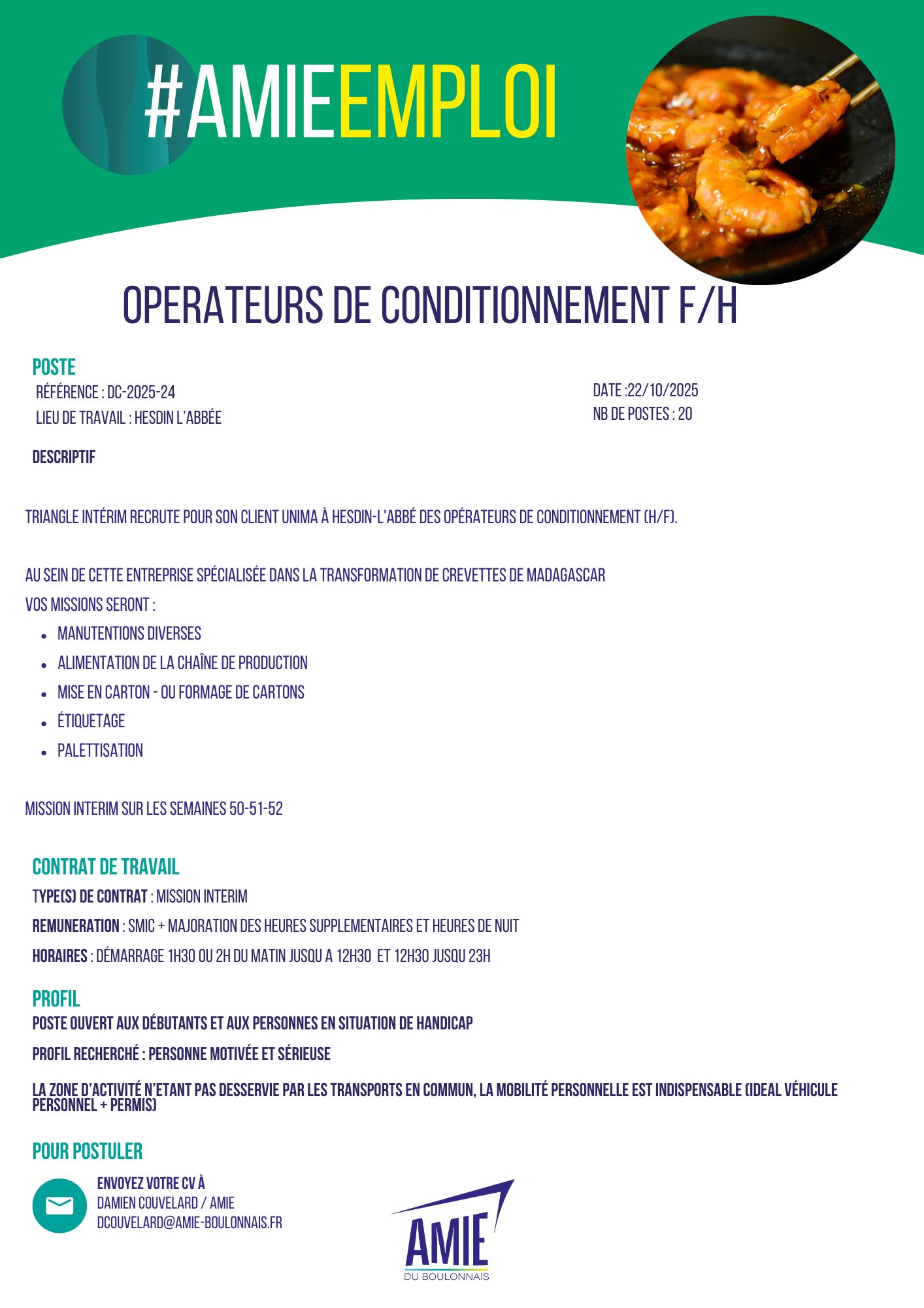 - Type de contrat : MISSION INTERIM A PARTIR DU 12/12